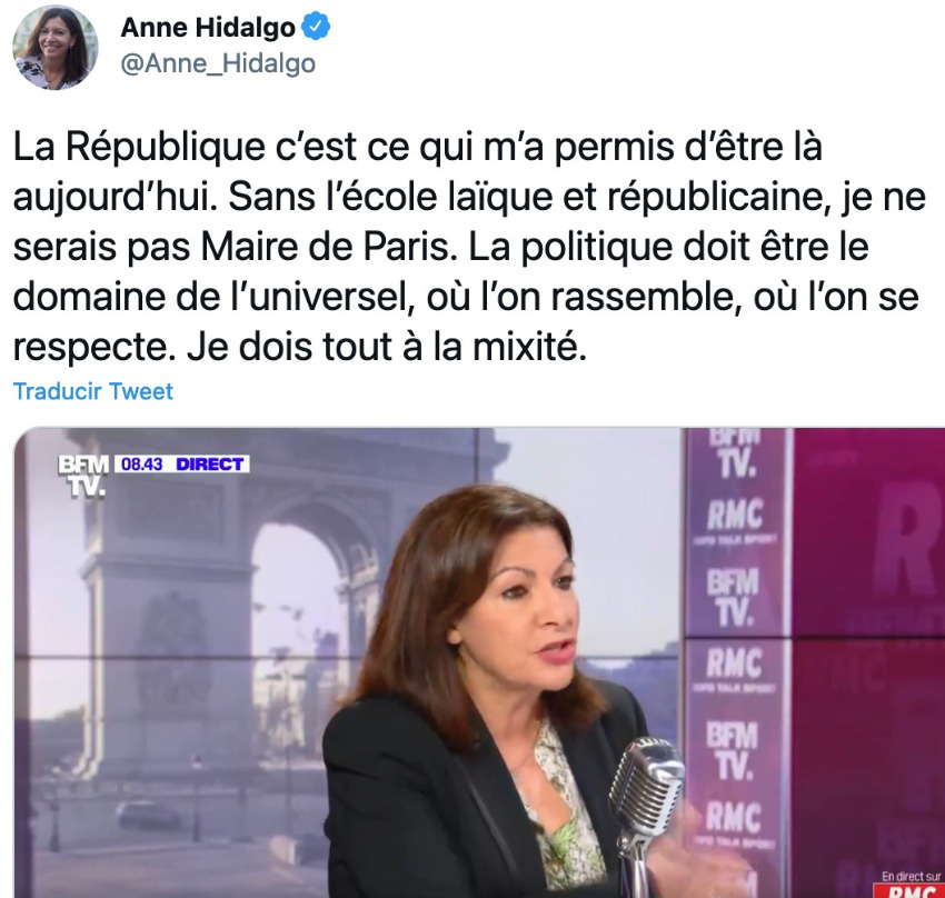 La República es lo que me permitió estar hoy aquí. Sin la escuela laica y republicana, no sería alcaldesa de París. La política debe ser el dominio de lo universal, donde uno se junta, donde uno se respeta. Yo debo todo a ese contexto. Anne Hidalgo